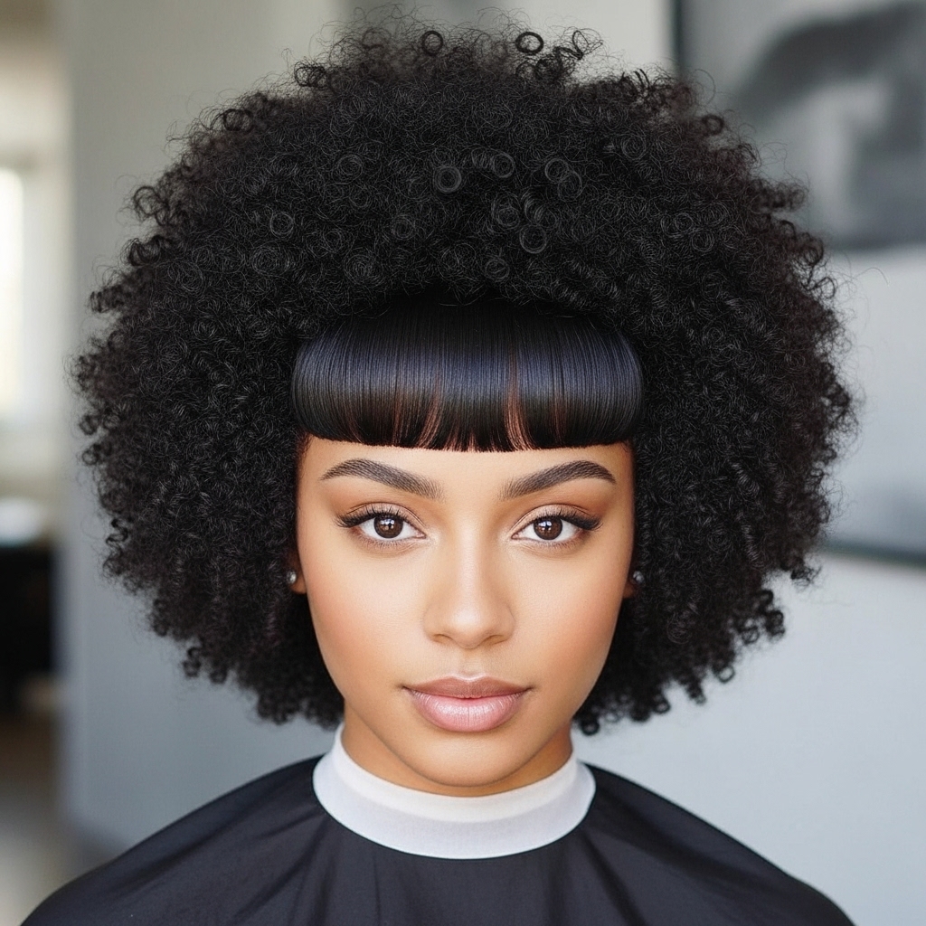This style adds volume by creating a strong horizontal line that contrasts with the vertical length of the rest of your hair. It immediately draws the eye upward, emphasizing the height of your crown. When paired with a shape like a tapered cut or a round afro, blunt bangs become the focal point that showcases the density and unique texture of your hair in its full, voluminous glory.