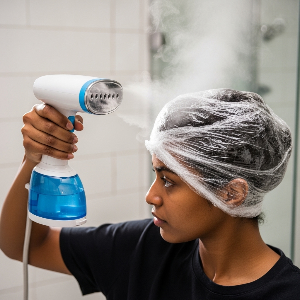 Apply conditioner, wrap your hair in plastic, then gently steam sections with the handheld steamer. Move continuously to avoid overheating.
