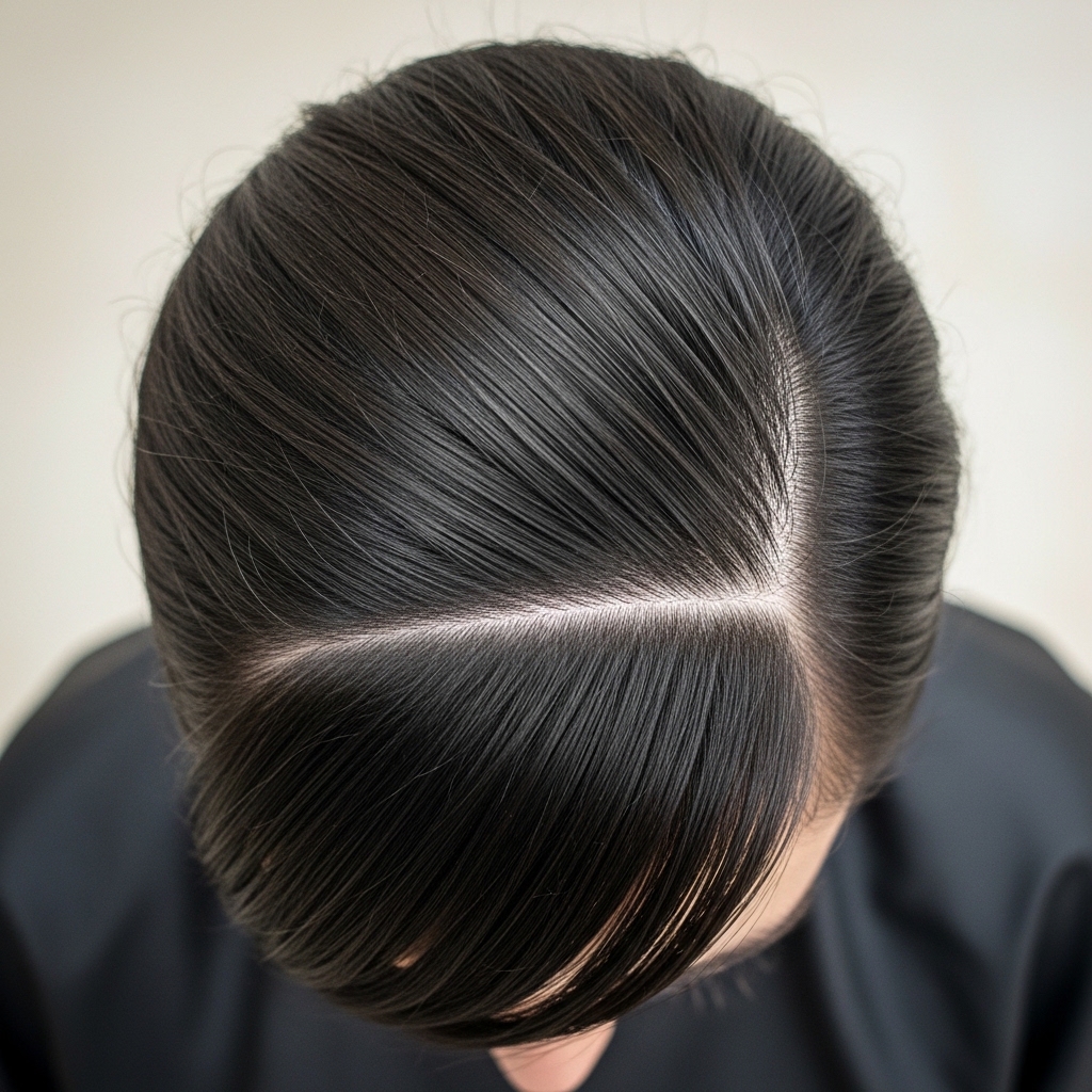 So, if your left side is longer, part your hair on the right. This naturally pushes the longer hair across your face, enhancing the diagonal line and creating beautiful volume at the crown.