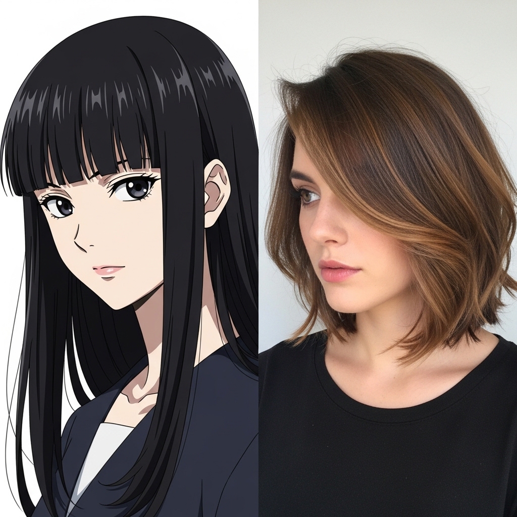 Our lob takes a note from its playbook by using clear, intentional lines but softens them immensely. Instead of blunt bangs, we use face-framing layers. Instead of a sharp chin-length line, we use a diagonal.