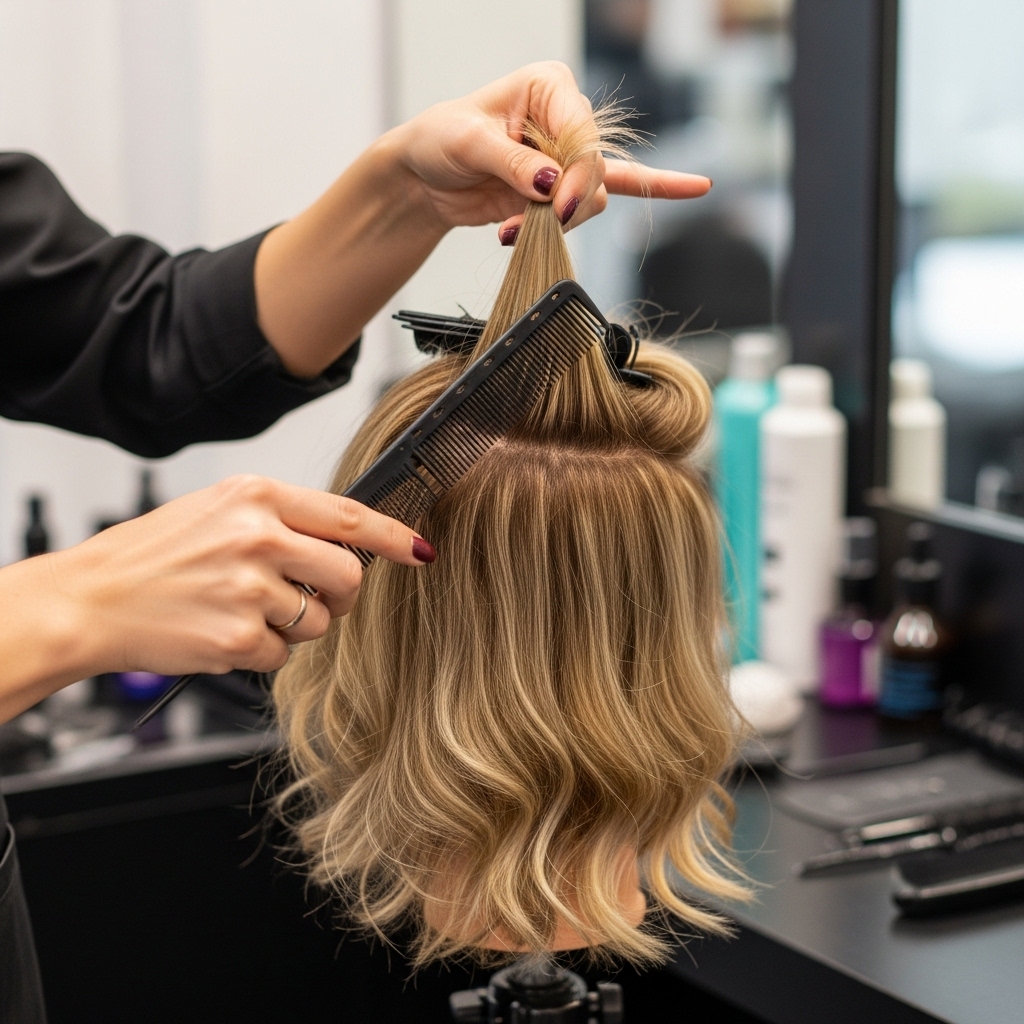Instead of teasing hair for volume (which causes breakage), salons lightly backcomb the underside of the top layer, then smooth over it. This creates lift without visible damage.