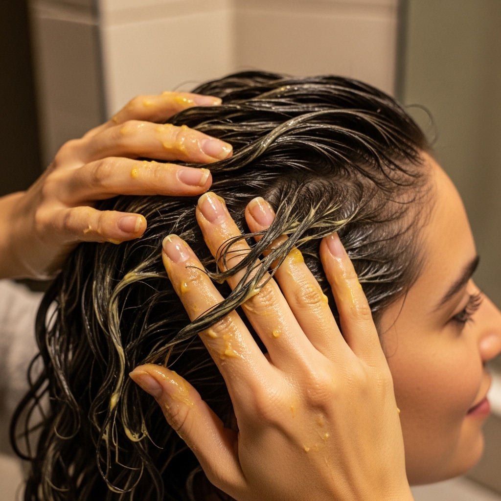 - Apply the mixture to damp hair, focusing on the mid-lengths and ends.
