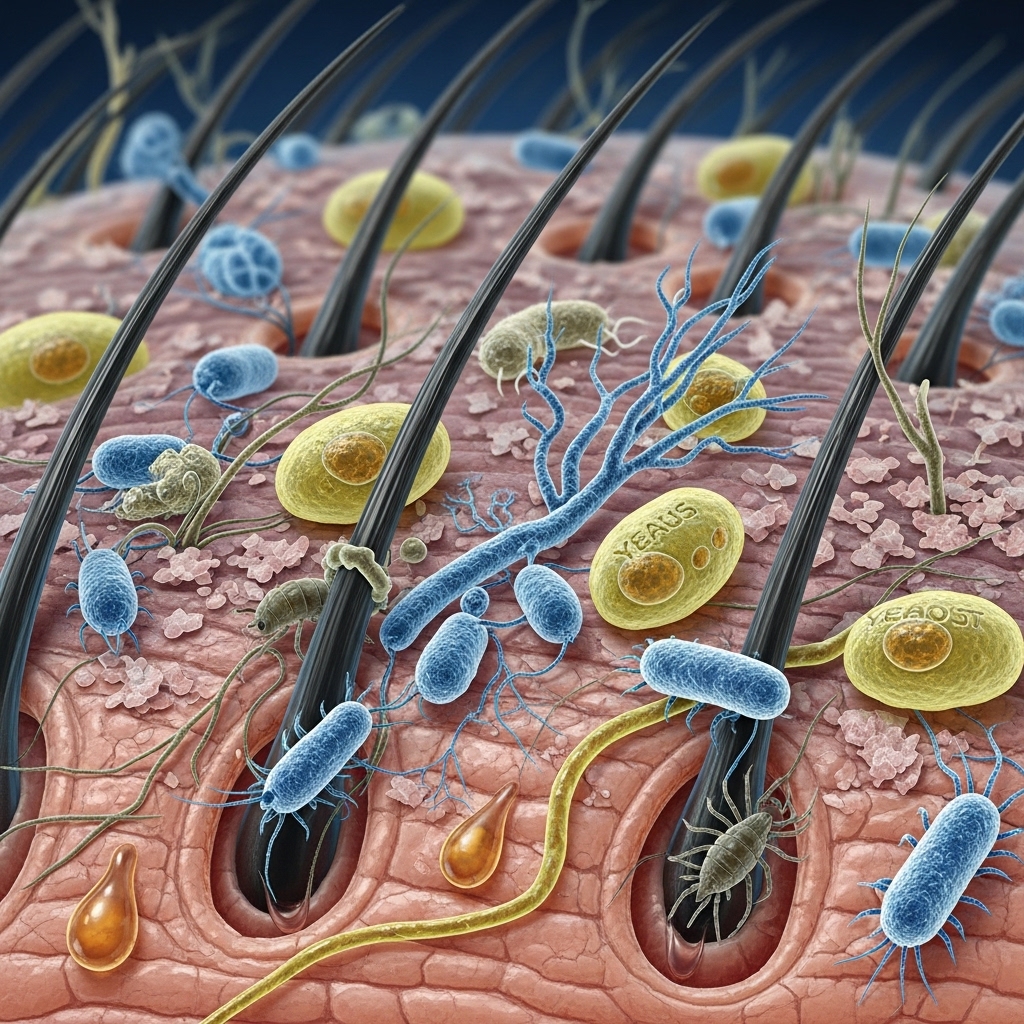 • Demodex mites (tiny, harmless creatures that live in hair follicles)
