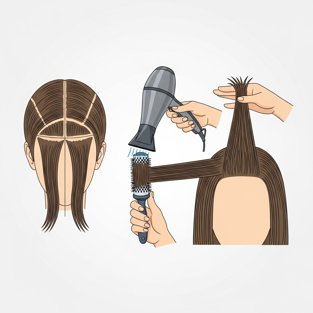 For the crown—the epicenter of volume—take vertical sections. Direct the hair slightly forward or backward (opposite its natural fall) as you dry to create lift right at the root. Use the cool shot to lock in that lift.