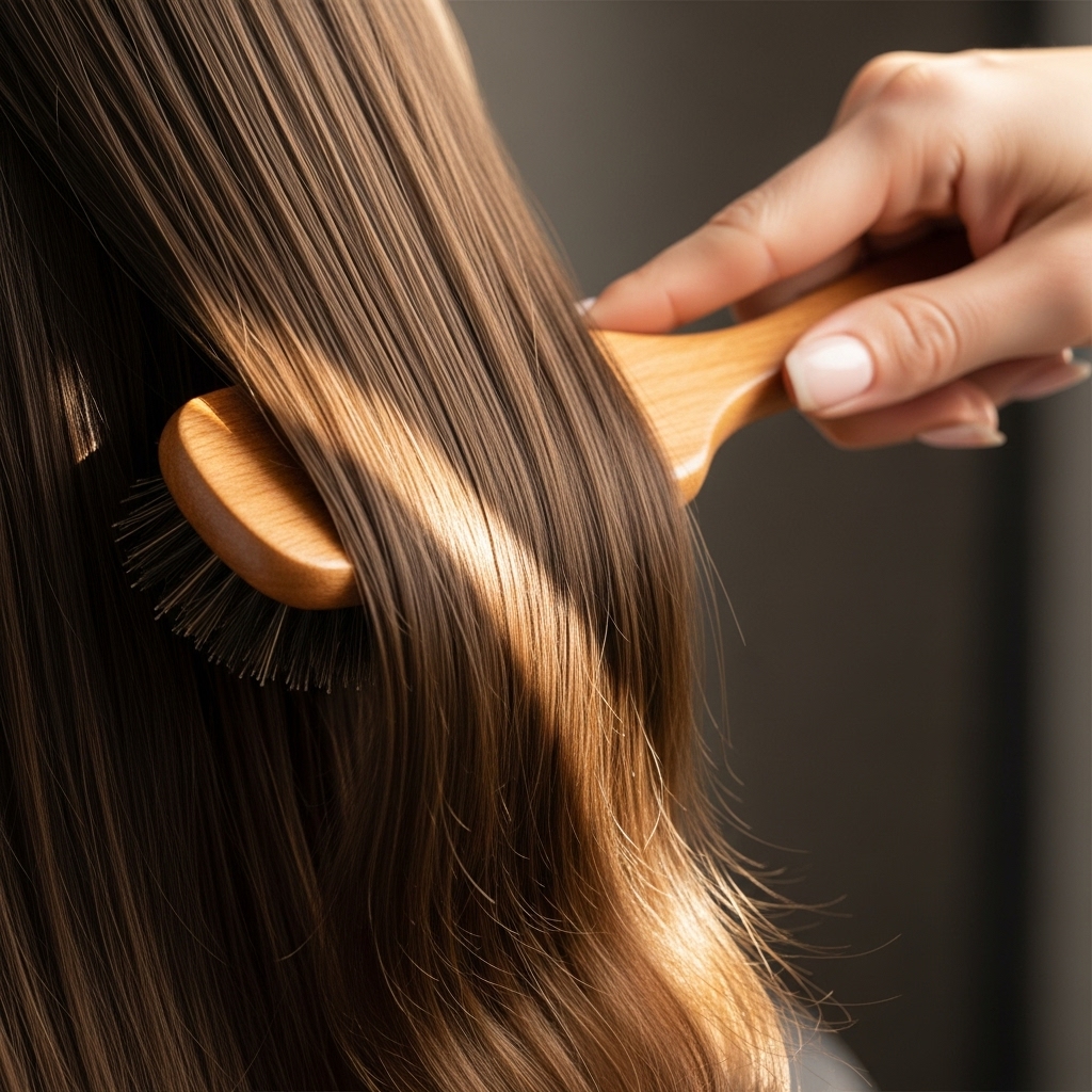 Once your hair is completely dry and smooth, it’s time for the polish. First, run a pure boar bristle brush through your hair. This distributes your scalp’s natural oils from root to tip, enhancing shine and smoothing the very top layer of hair. Next, if you have any stubborn flyaways, take a tiny drop of hair serum or even a clean toothbrush spritzed with hairspray to gently tame them.