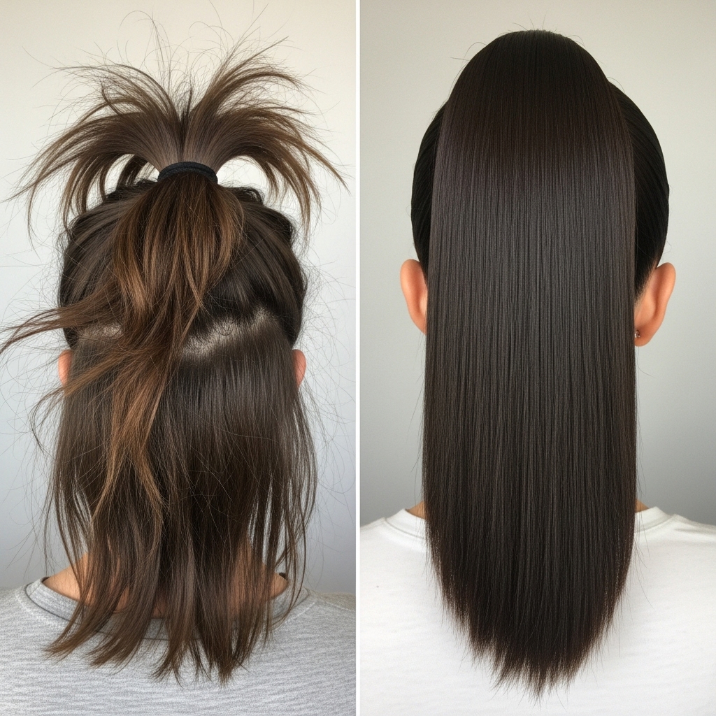 Problem: The Ends Look Wispy, Not Blunt. Solution: This is where your flat iron comes in. Clamp the very ends of the ponytail and press them together, sliding the iron down to create a unified, sharp edge. A small dot of strong-hold gel pressed onto the ends can also do the trick.