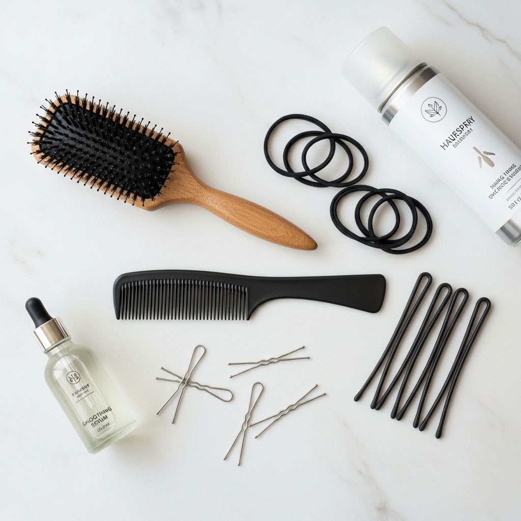 Next, arm yourself with the right tools. You’ll need a fine-tooth comb, a boar bristle brush for smoothing, strong-hold hair elastics (the thin, clear or matte ones are best), a light-hold hairspray or smoothing serum, and some bobby pins that match your hair color. A crucial pro tip: lightly mist your comb with hairspray before running it through your hair. This helps tame flyaways instantly without creating a crispy, helmet-head effect.