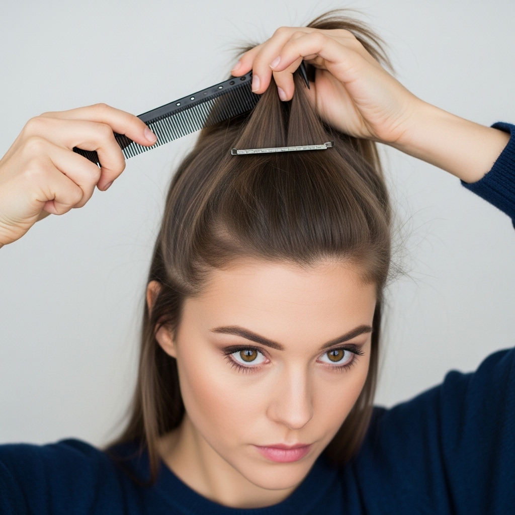 3. Stand up straight and look in the mirror. Now, gently pull the front section of your hair slightly forward to create a bit of volume and looseness at the front. This prevents a severe, “scalped” look.