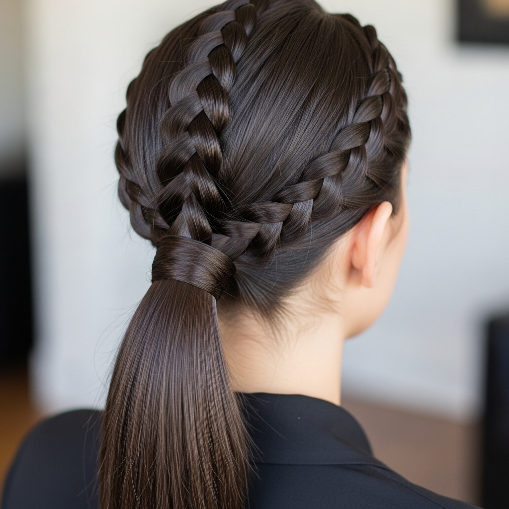 6. The result is a beautiful, crown-like detail that leads into a sleek ponytail, perfect for keeping hair off your face in the most stylish way possible.