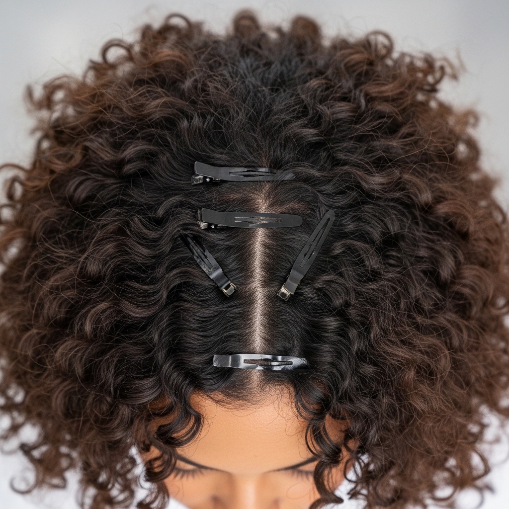 This is a pro trick that’s so easy. After styling, while your hair is still damp or as it’s air-drying, take small sections of hair at the crown and clip them at the root. Use duckbill clips or small jaw clips.